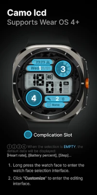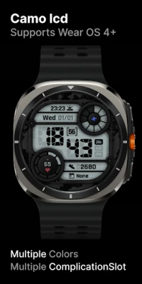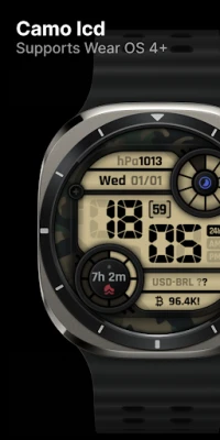 Персонализирайте своя часовник с Camo LCD: Watch Face за Wear OS 4+. Този класически циферблат разполага с LCD цифри, камуфлажен фон и над 10 цветови опции. Показва час, дата, пулс, стъпки и батерия. Включва 6 слота за усложнения и AOD дисплей.