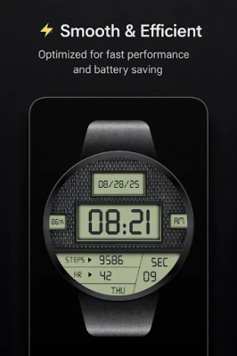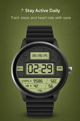 С Digitec LCD Display Watch Face винаги ще имате най-важните данни на една ръка разстояние. Насладете се на кристално ясното дигитално време в стил LCD, което е лесно за разчитане с един поглед. Поддържайте активен начин на живот с вградения брояч на стъпки в реално време и следете сърдечния си ритъм през целия ден. Никога не се чудете за заряда на батерията си благодарение на ясния индикатор за процент. Организирайте деня си без усилие с показания за дата, ден, секунди и AM/PM формат, с възможност за избор между 12-часов и 24-часов режим според вашите предпочитания. Всичко това е оптимизирано за плавна и ефективна работа, включително функцията за винаги включен дисплей (AOD), осигуряваща перфектна видимост дори когато часовникът е в покой.