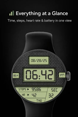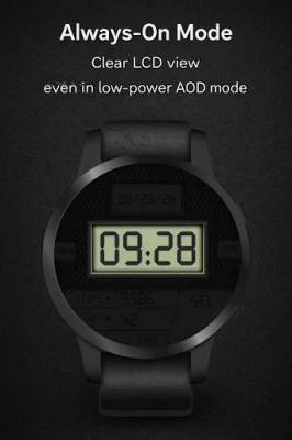 С Digitec LCD Display Watch Face винаги ще имате най-важните данни на една ръка разстояние. Насладете се на кристално ясното дигитално време в стил LCD, което е лесно за разчитане с един поглед. Поддържайте активен начин на живот с вградения брояч на стъпки в реално време и следете сърдечния си ритъм през целия ден. Никога не се чудете за заряда на батерията си благодарение на ясния индикатор за процент. Организирайте деня си без усилие с показания за дата, ден, секунди и AM/PM формат, с възможност за избор между 12-часов и 24-часов режим според вашите предпочитания. Всичко това е оптимизирано за плавна и ефективна работа, включително функцията за винаги включен дисплей (AOD), осигуряваща перфектна видимост дори когато часовникът е в покой.