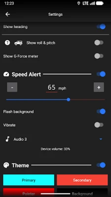 Персонализацията е от ключово значение. Изберете измежду разнообразие от стилни скали на тахометъра, за да съответстват на вашите предпочитания, и персонализирайте интерфейса на приложението с богата цветова палитра. За допълнителна безопасност и информираност, настройте звукови и визуални предупреждения за скорост, които ви уведомяват при превишаване на предварително зададени лимити. Този цялостен набор от инструменти гарантира, че разполагате с цялата съществена информация на една ръка разстояние, представена точно по начина, по който желаете. А това е само част от всичко, което предстои да откриете.