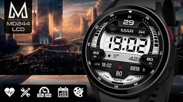 "MD244 LCD" е елегантен дигитален циферблат за часовници с Wear OS, разработен от Matteo Dini MD. Той преобразява вашия смарт часовник с модерен дизайн, осигуряващ ясен изглед на времето и основните данни.