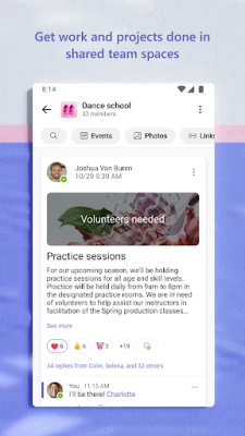 Teams трансформира начина, по който работите заедно, като осигурява централизирано пространство за споделяне на снимки, видеоклипове и достъп до документи и файлове в облачното хранилище, независимо къде се намирате. Поддържайте всички наясно със списъците със задачи, където можете да задавате задачи, да определяте крайни срокове и да отбелязвате изпълнени елементи. Извлечете максимума от всяка среща с функции като споделяне на екран, интерактивна бяла дъска и виртуални стаи за обсъждане, гарантирайки продуктивни дискусии. Управлявайте достъпа до информация и организирайте споделено съдържание в общности – събития, снимки, връзки – така че никога да не губите време в търсене.