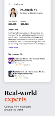 В приложението Udemy ще учите от експерти с реален опит в широк спектър от теми – от технологии и бизнес до творческо мислене и личностно развитие. Благодарение на препоръки, задвижвани от изкуствен интелект, гъвкави формати и инструменти, които се вписват във вашето ежедневие, Udemy превръща непрекъснатото израстване в естествена част от живота ви.
